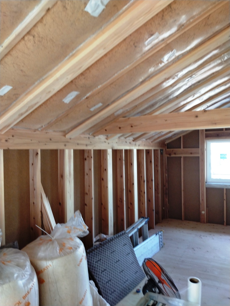 ここでも壁面には羊毛断熱材ウールブレスを入れて優れた調湿性で住まいを守ります。屋根面のシュタイコ〈STEICO〉の比熱容量で暑さから守り、壁面のウールブレスで湿度を調整して、この夏も快適に過ごせる住まいになりそうです!